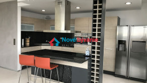 Pracovná doska a zástena sú zo žuly, je tu veľa úložného priestoru, zabudované spotrebiče TEKA - kompaktná rúra s mikrovlnkou, indukčná varná doska, odsávač pár, umývačka riadu, kameninový drez, automatický kávovar, americká chladnička s výrobníkom ľadu a dávkovačom vody.
