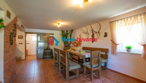 Obývacia časť s teplovzdušným krbom s prieduchmi na vykurovanie horných izieb, komfortnou sedačkou, TV láka na chvíle pohody a odpočinku po športových hrách na Vašich kurtoch, prechádzkach po neďalekých lesoch alebo vodných športoch na vodnej nádrži v Nimnici.