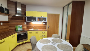 Vchádza sa hlavným vchodom a prístupovými schodmi na 1. Poschodie, kde treba prejsť širokou chodbou na koniec ku vchodu do bytu. Vchádzame do kuchyne, ktorá je otvorená/spojená s obývačkou. Z kuchyne sa dverami dostaneme do spálne.