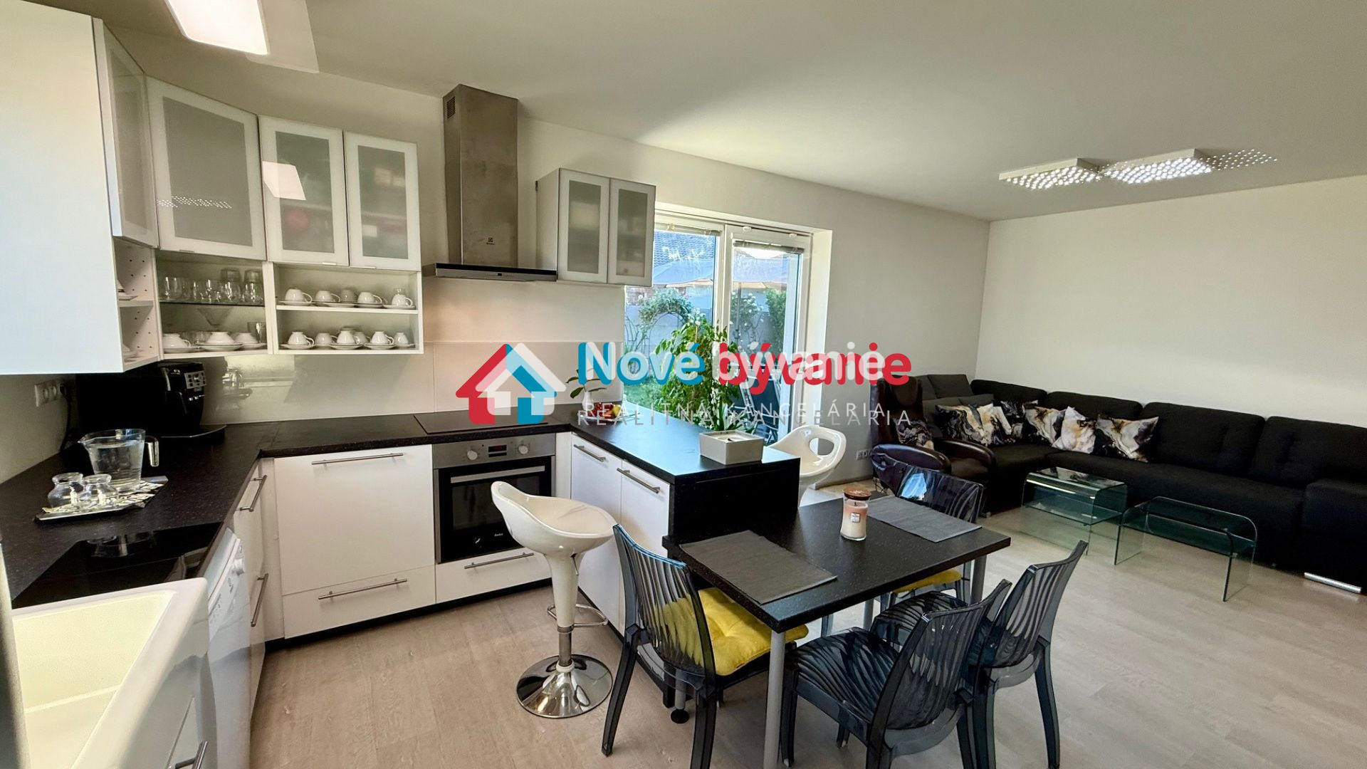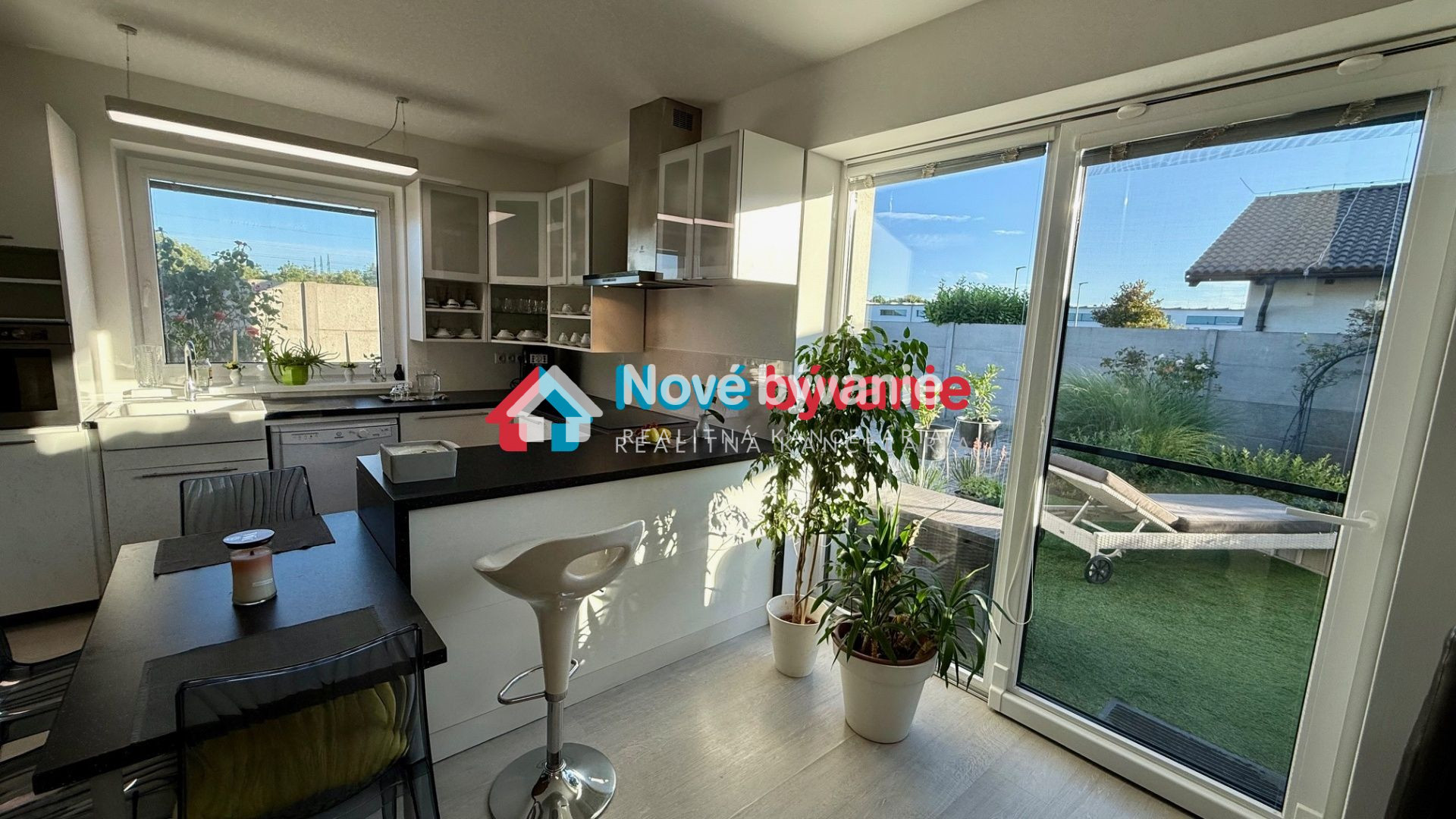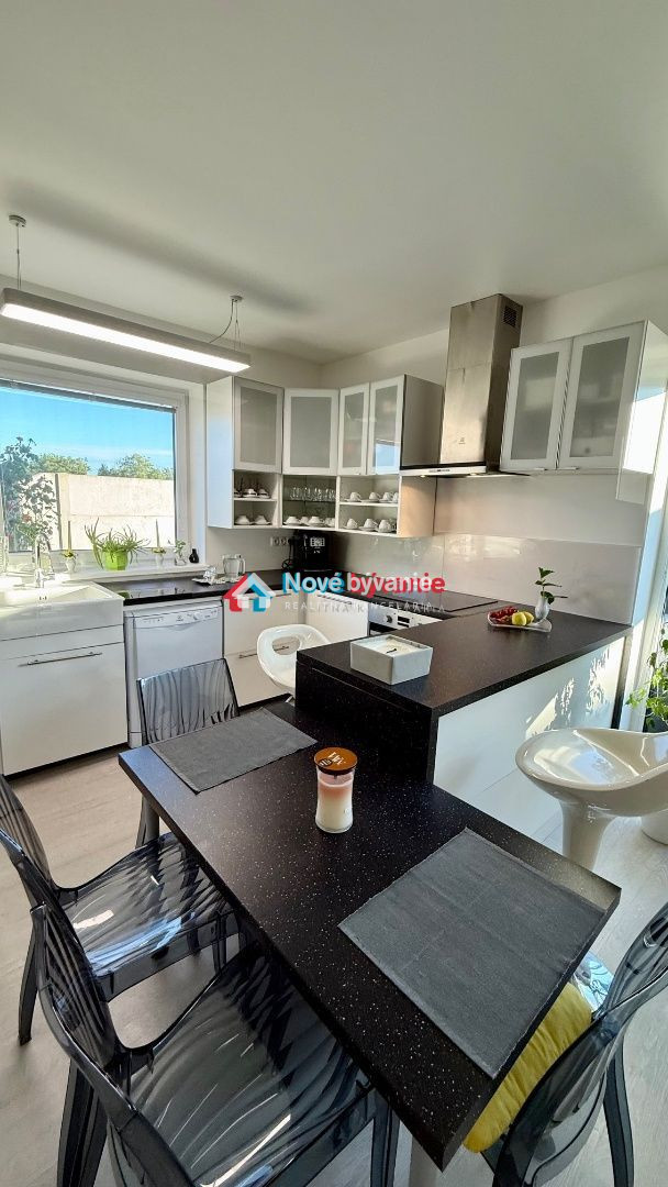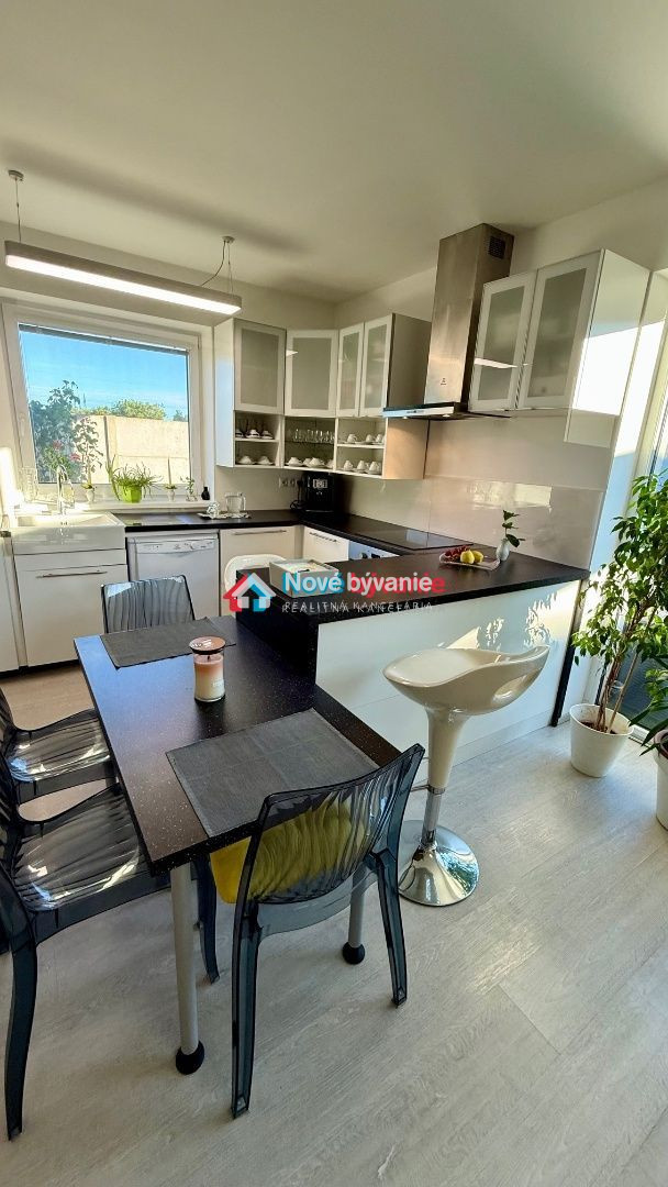 kuchyňa - biela kuchynská linka plne vybavená elektrospotrebičmi - indukčná varná doska, el. rúra, digestor, umývačka riadu, keramický biely drez, okno pri dreze, kuchynský ostrov, barové stoličky, jedálenský stôl, stoličky