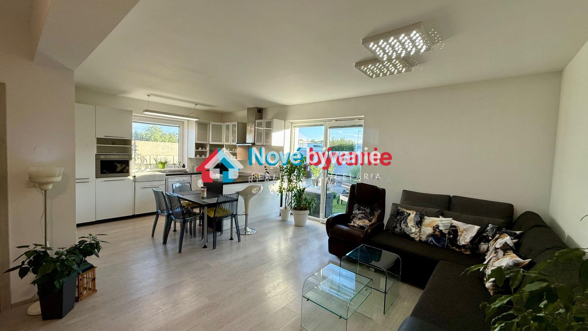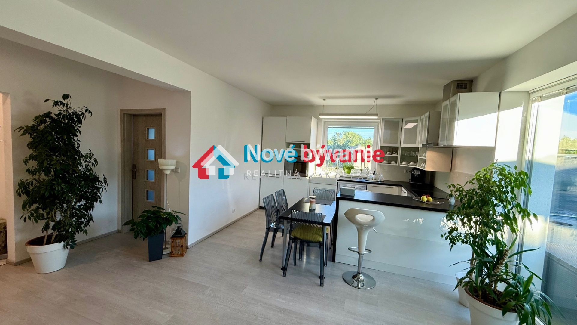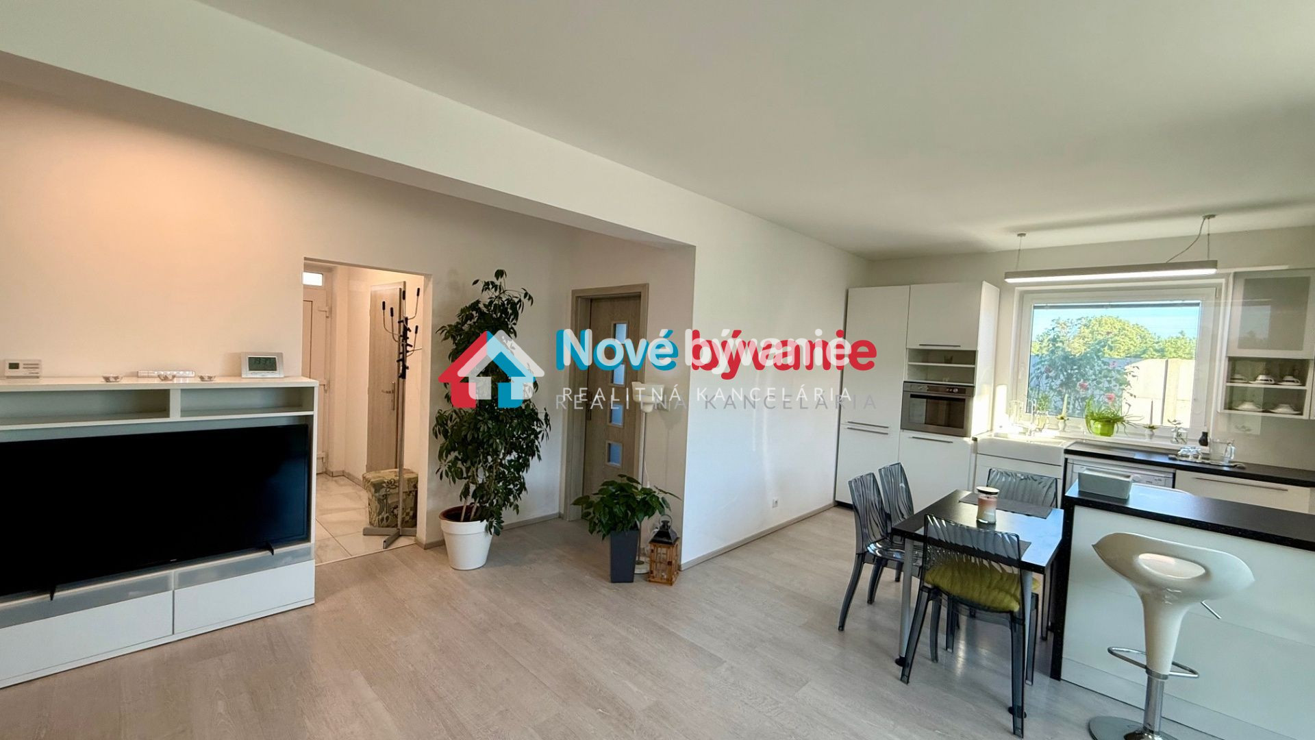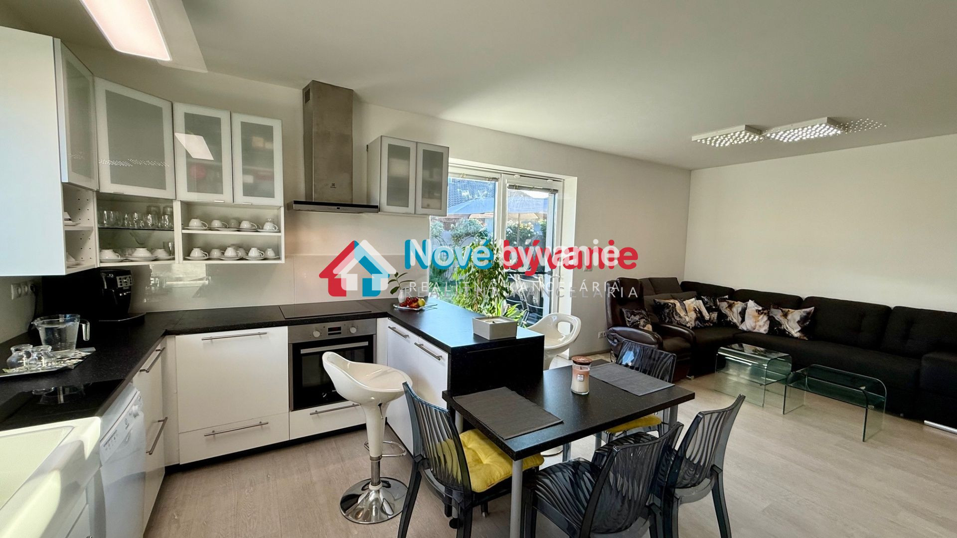 kuchyňa - biela kuchynská linka plne vybavená elektrospotrebičmi - indukčná varná doska, el. rúra, digestor, umývačka riadu, keramický biely drez, okno pri dreze, kuchynský ostrov, barové stoličky, jedálenský stôl, stoličky