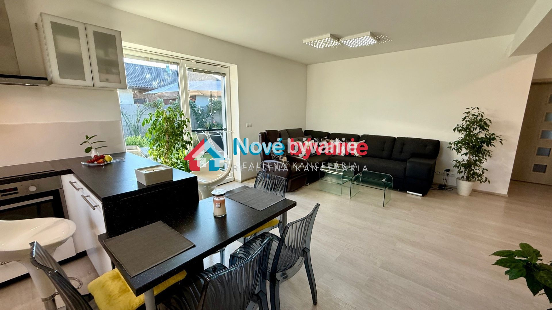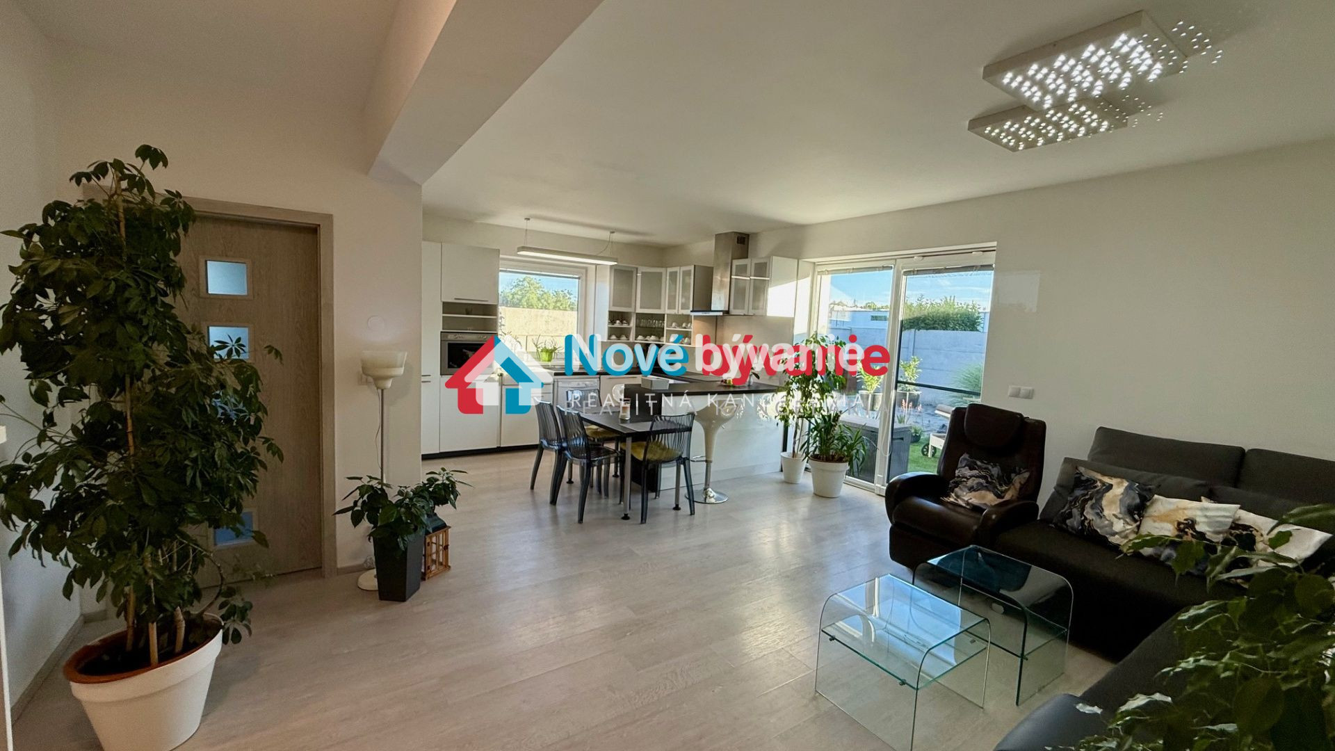 obývacia izba s jedálenskou časťou a plne vybavenou kuchyňou - otvorená dispozícia spolu so vstupnou chodbou - výstup na priestrannú terasu so jacuzzi a záhradným posedením s veľkým slnečníkom, veľa kvetov