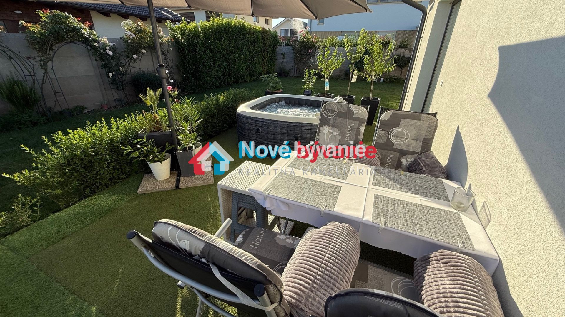veľká terasa so záhradným jedálenským posedením, skrinkou na ukladanie záhradných vankúšov, veľký slnečník