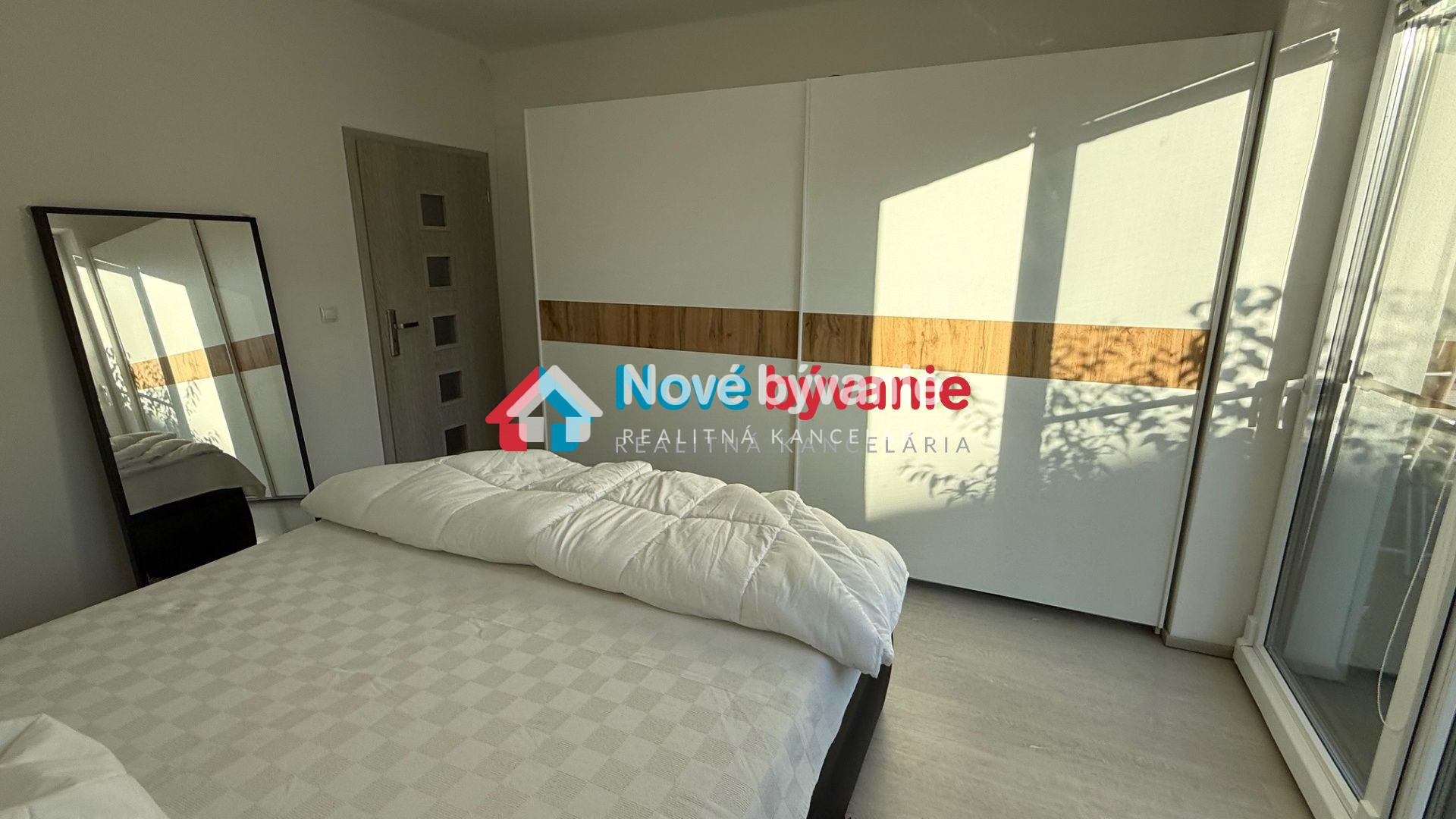izba - veľký šatník, veľká posteľ, nočné stolíky, výstup cez veľké francúzske okno na terasu