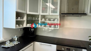 kuchyňa - biela kuchynská linka plne vybavená elektrospotrebičmi - indukčná varná doska, el. rúra, digestor, umývačka riadu, keramický biely drez, okno pri dreze, kuchynský ostrov, barové stoličky, jedálenský stôl, stoličky
