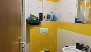 Kúpeľňa je menšia, no vybavená všetkým, čo potrebujete – sprchovým kútom, umývadlom a toaletou. Interiér dopĺňa masívna drevená podlaha, ktorá dodáva bytu teplú a príjemnú atmosféru.