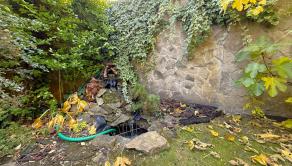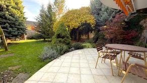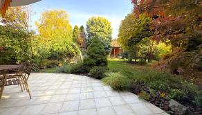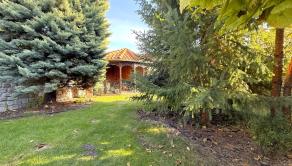 Exteriér pôsobí rovnako reprezentatívne. Na južnej strane sa nachádza okrasná záhrada s vodopádom, udržiavaným trávnikom, stromami a kríkmi. K dispozícii je automatické zavlažovanie zo studne, pitná voda v záhrade a priestor na oddych na terase či grilovanie vedľa vlastného altánku.