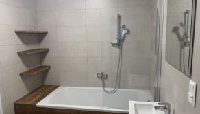 Kúpeľňa je priestranná, s vaňou a miestom na práčku, toaleta je samostatná. Byt má vlastný bojler na teplú vodu – nový a certifikovaný.
