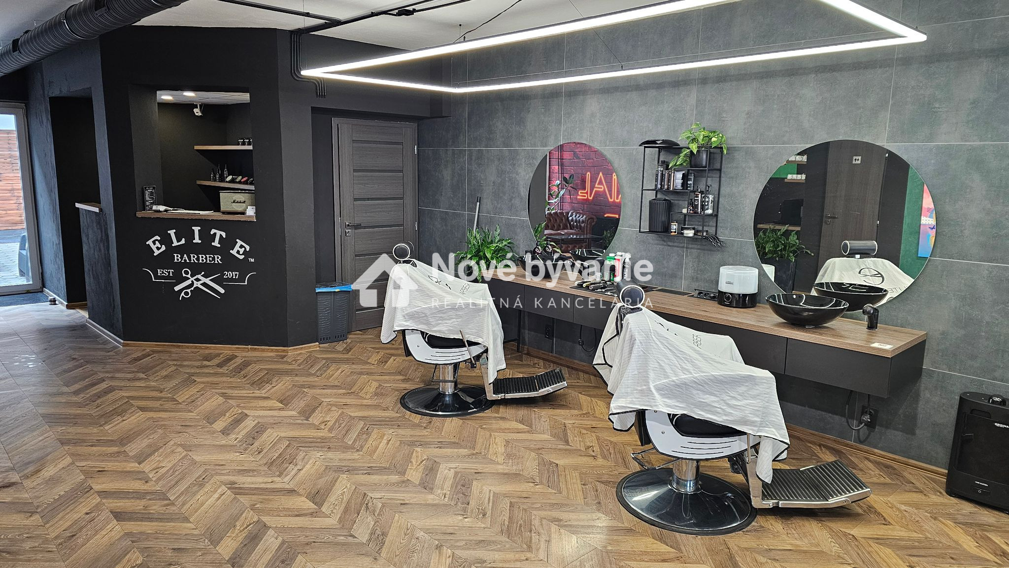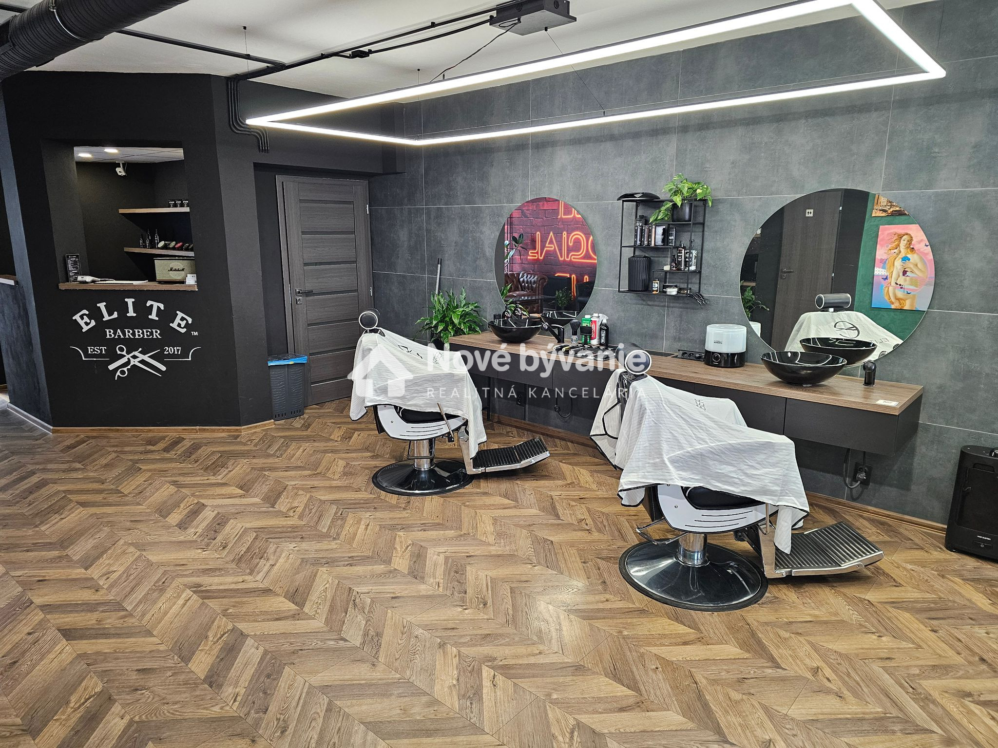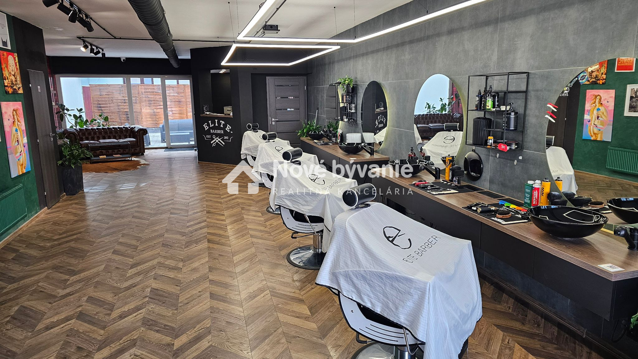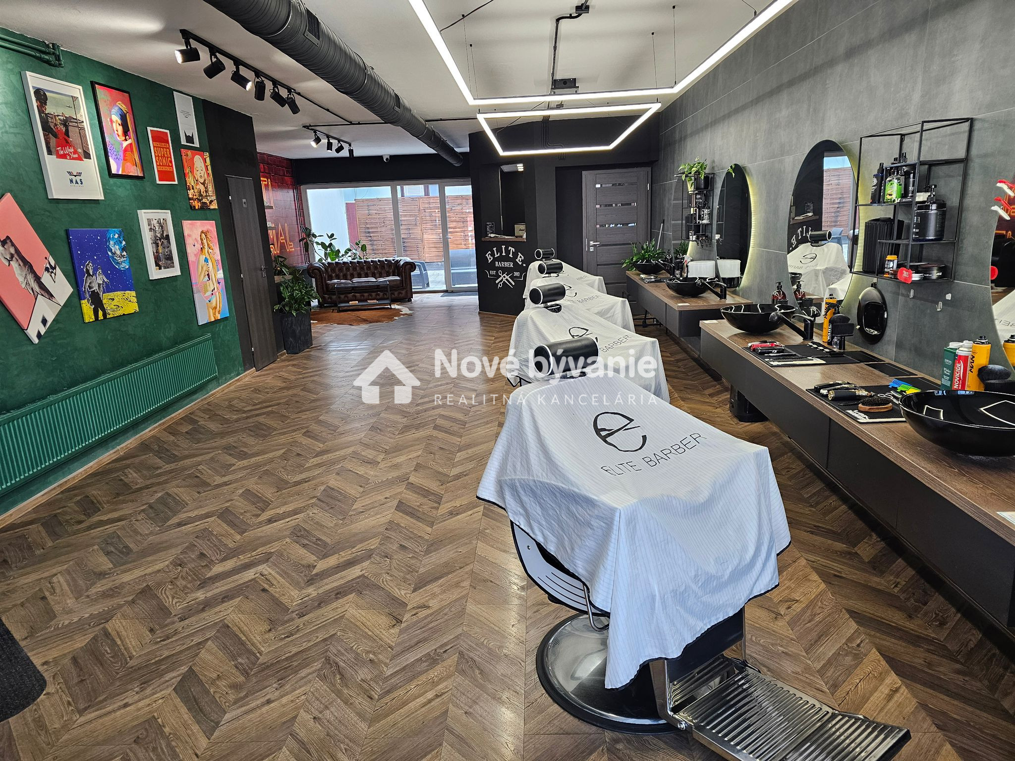 Vybavenie interiéru: štýlový a pripravený na okamžité používanie. Kožená sedačka Chesterfield, dizajnové osvetlenie, „ANTI SOCIAL CLUB“ neón. Kompletný nábytok vrátane barového pultu, regálov, rastlín, kuchynskej linky Terasa je vybavená s ratanovou zostavou. Barber prevádzka má stabilnú klientelu a licenciu ELITE. Prevádzka má vybudované meno, verných zákazníkov a možnosť zachovania značky ELITE. Samostané číslo na prevádzku, online rezervačný systém.
