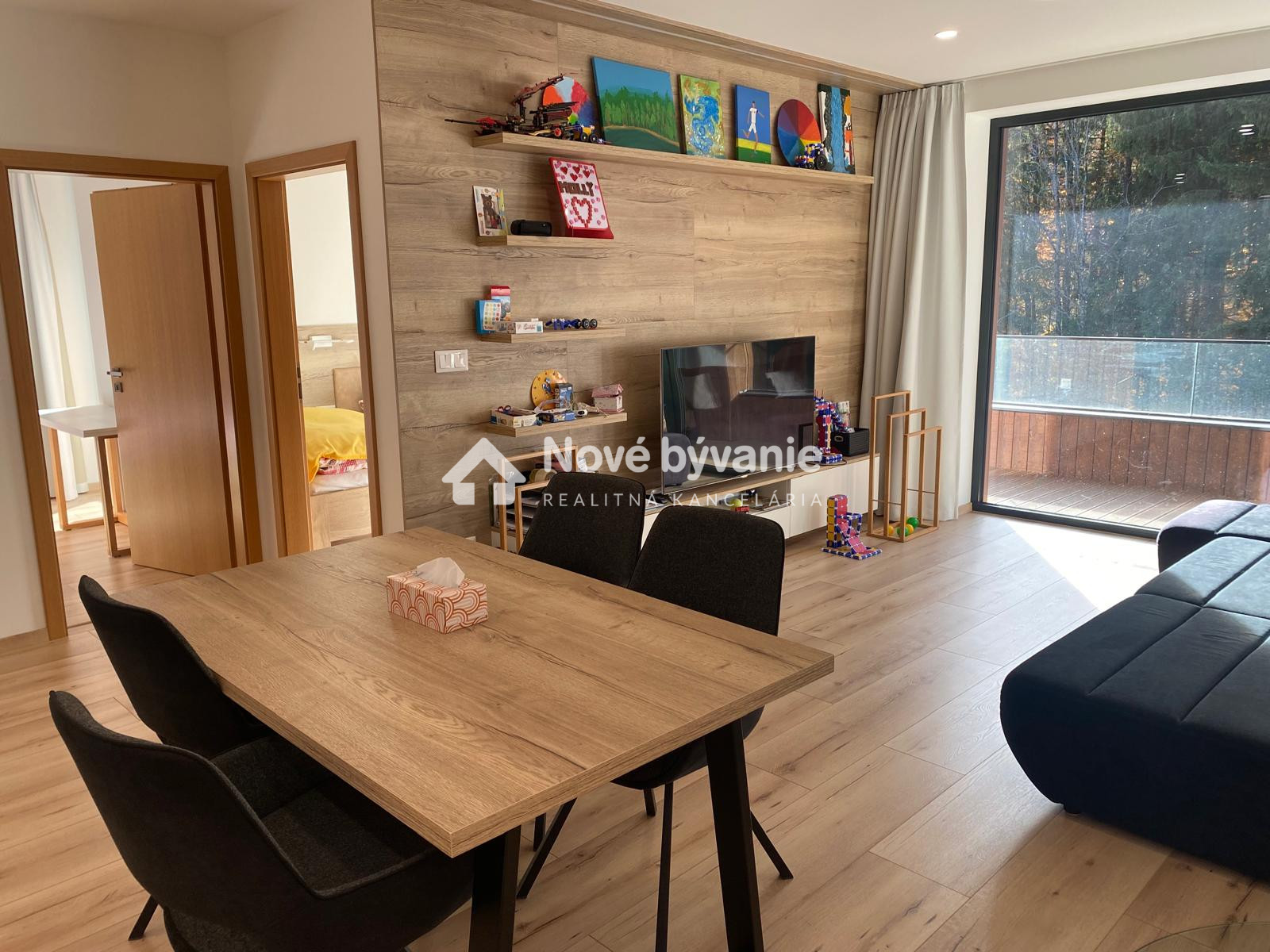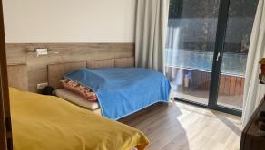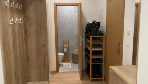 Byt pozostáva z: vstupnej predsiene, priestrannej obývacej izby s krbom a výstupom na terasu, kuchyne s kvalitnými vstavanými spotrebičmi a jedálenským stolom, hlavnej spálne s veľkou posteľou, detskej/hosťovskej izby taktiež so vstupom na terasu, kúpeľne s rebríkovým radiátorom, samostatného WC.