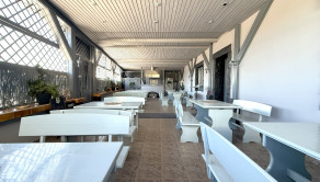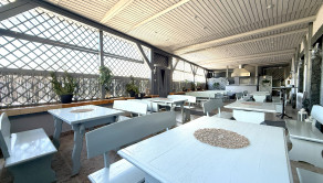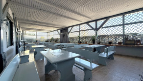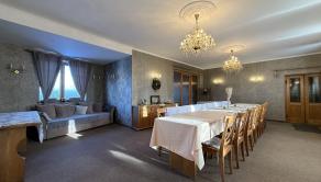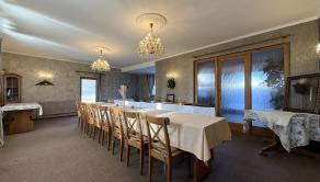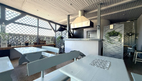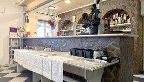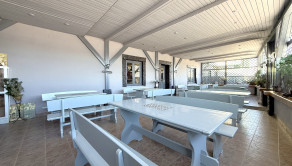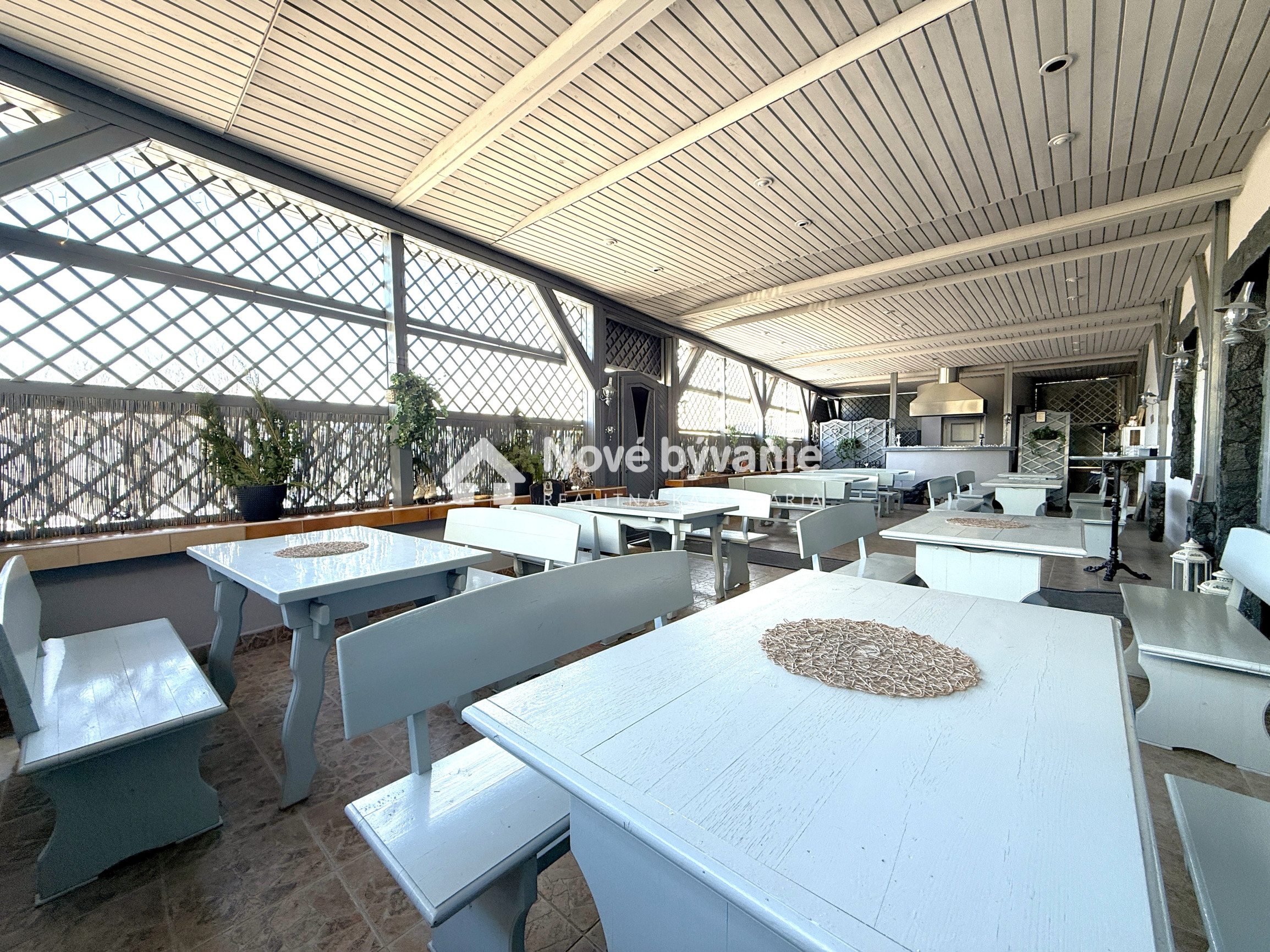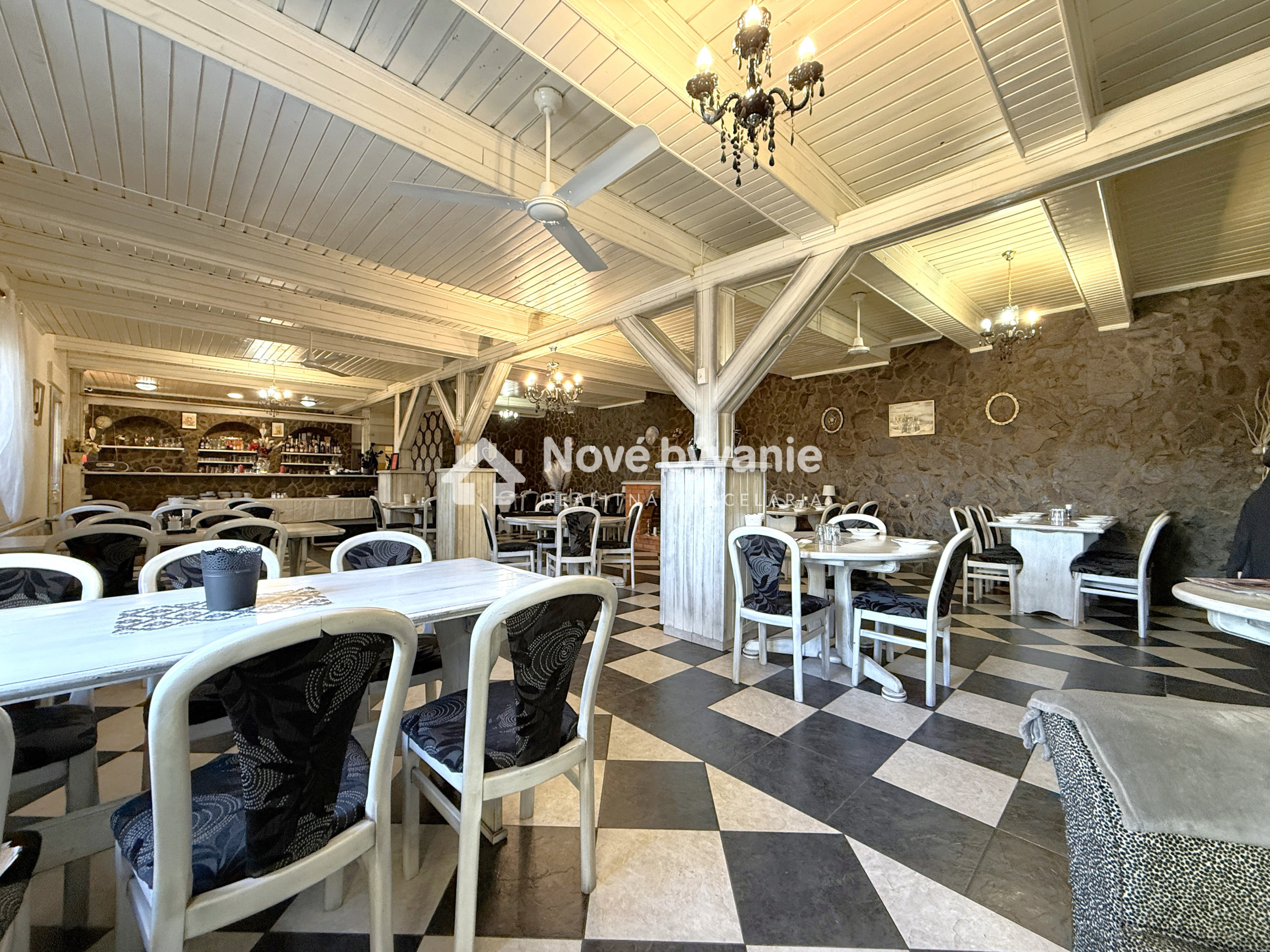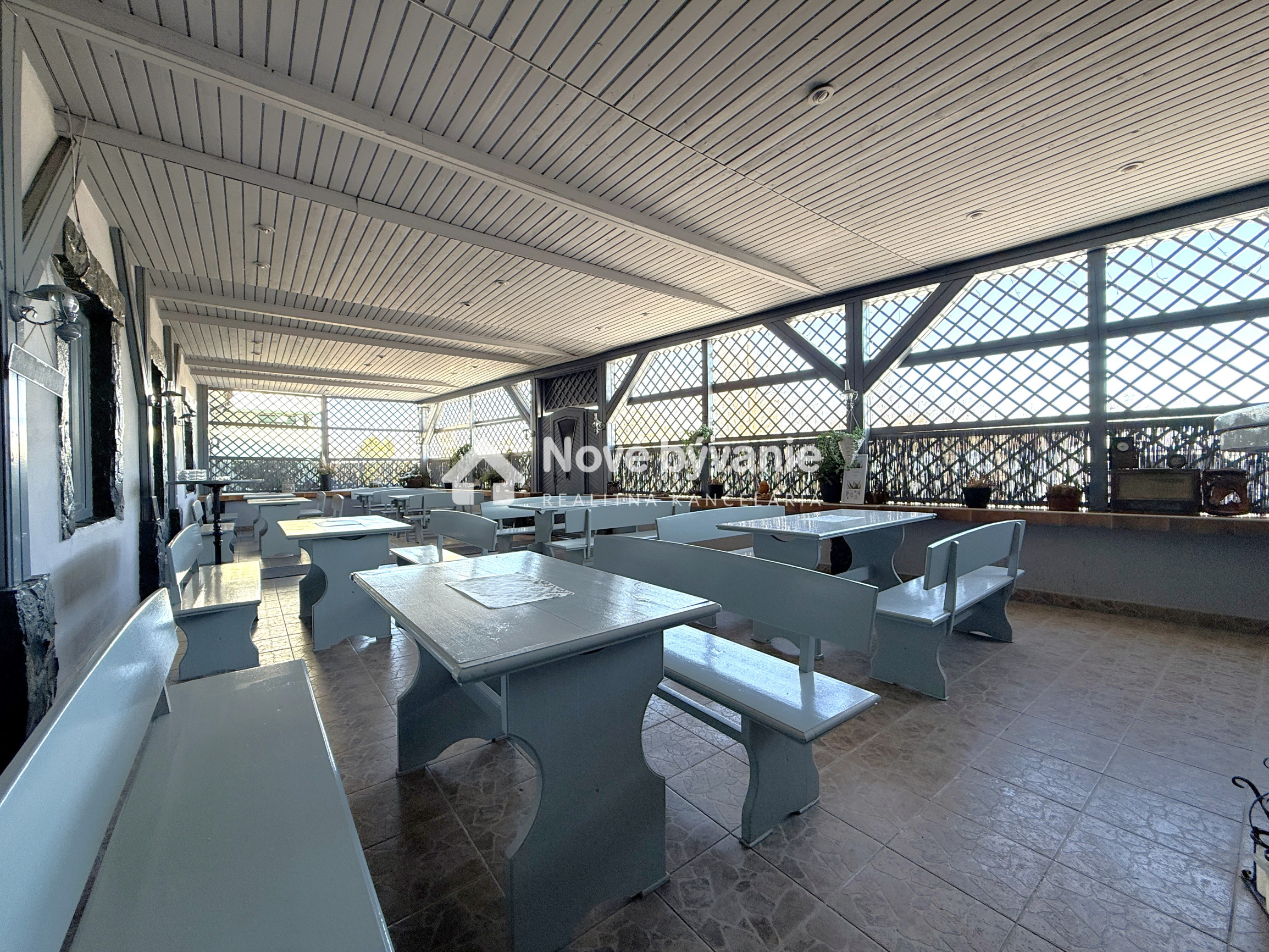 Prízemie dispozične pozostáva z prednej terasy o výmere približne 100 m², priestrannej jedálne s barom a dvomi toaletami, plne pripravenej kuchyne na prevádzku, skladových priestorov, salónika určeného na spoločenské akcie s výstupom na ďalšiu terasu, predsiene s dvomi toaletami a schodiskom na poschodie.