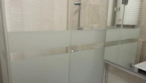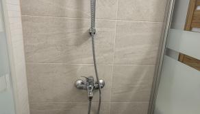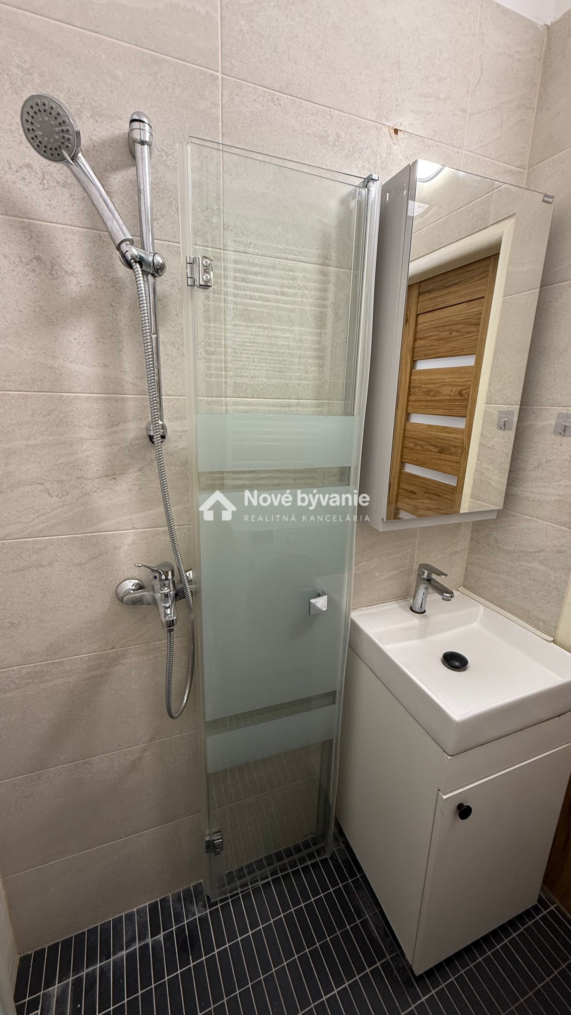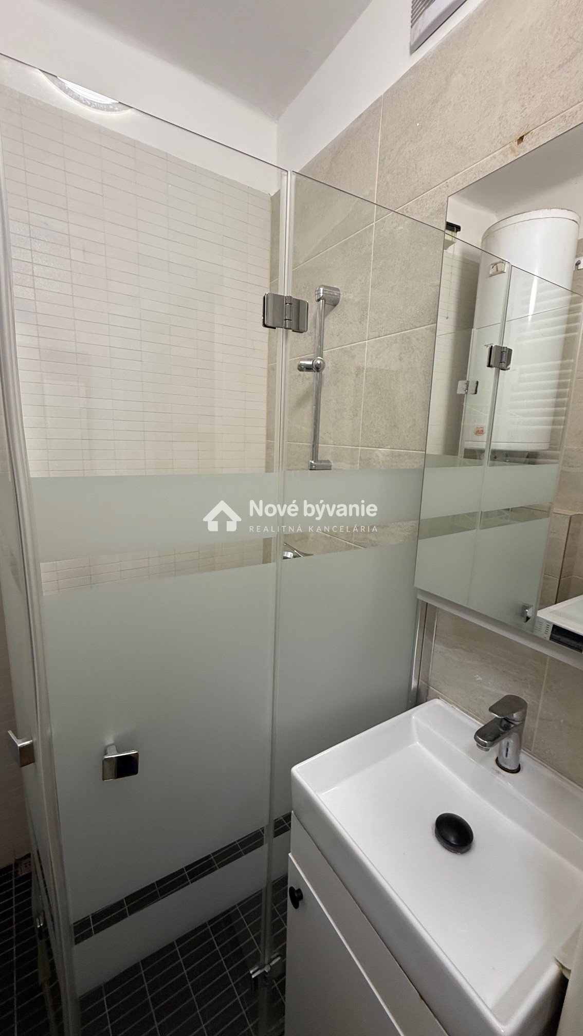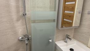 kúpeľňa - veľký bezbarierový sprchový kút, umývadlo, skrinka, zrkadlo, bojler na vodu, el. radiátor