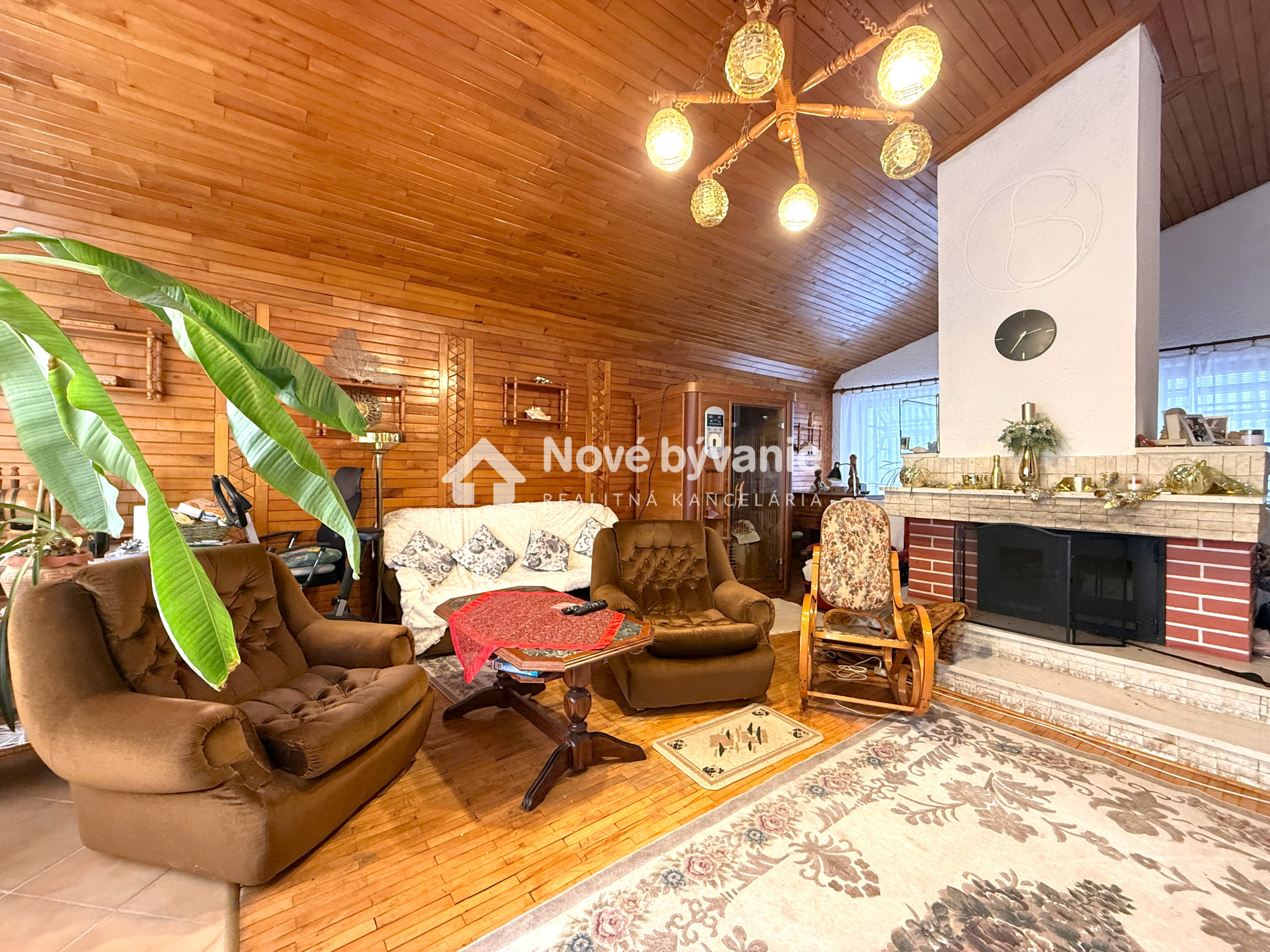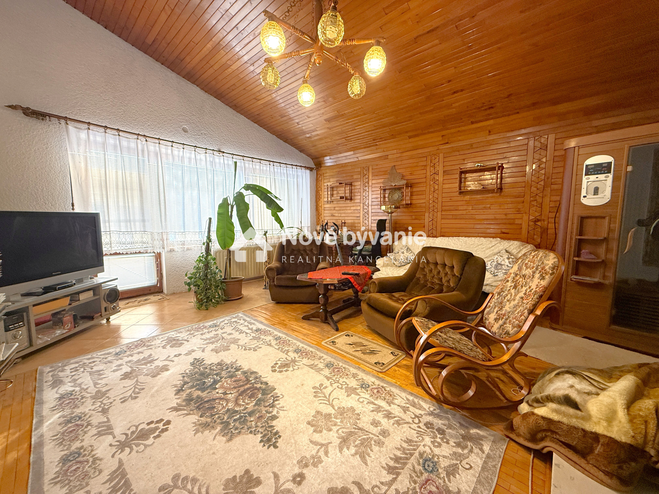 Na medziposchodí sa nachádza priestranná obývacia izba s dominantným krbom, ktorý vytvára jedinečnú atmosféru domova a ideálne miesto na rodinné stretnutia či pokojné večery. Tento reprezentatívny priestor je doplnený klavírom a z obývacej izby je z jednej strany vstup na veľkú terasu a z druhej strany na balkón, čo zabezpečuje dostatok svetla počas celého dňa.