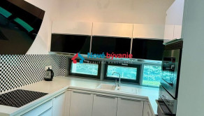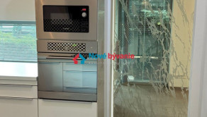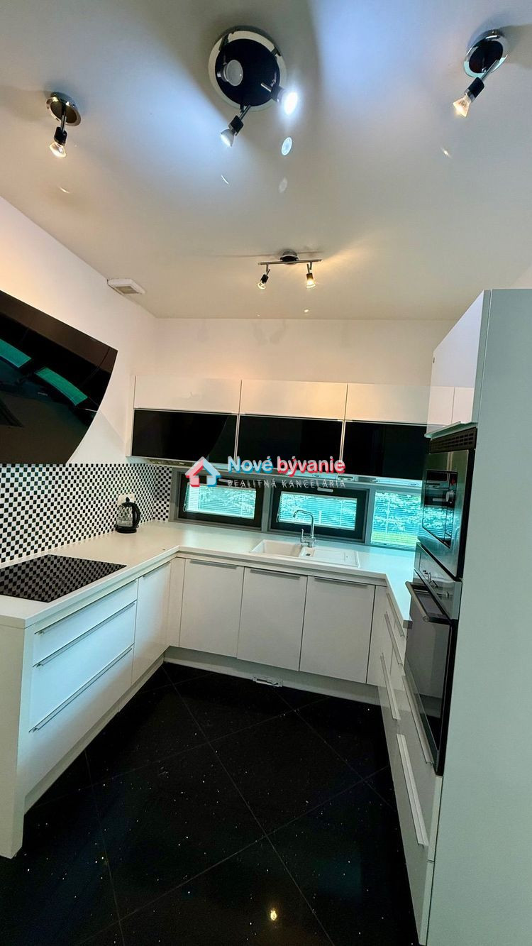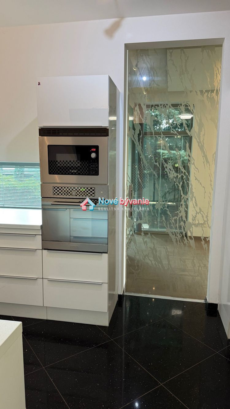 Kuchyňa je do tvaru U s oknami s výhľadom do záhrady, komplet vybavená elektrospotrebičmi, bonus - výťah na potraviny z prízemia rovno do kuchyne. Z 2 obývacích izieb je výstup priamo na terasy do záhrady, ktorá je vzrastlou zeleňou oddelená od susedov pre maximum súkromia počas celého roka.