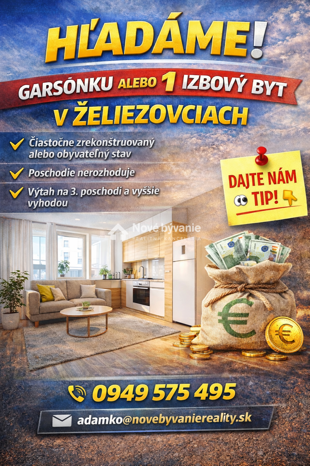 Pre konkrétneho klienta hľadáme garsonku alebo1-izbový byt v meste Želiezovce.