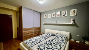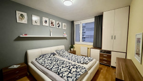 Druhá izba má manželskú posteľ (obe pevné lôžka majú veľký úložný priestor), 2 vstavané skrine s množstvom úložného priestoru a police.