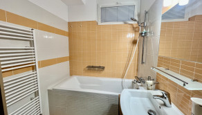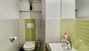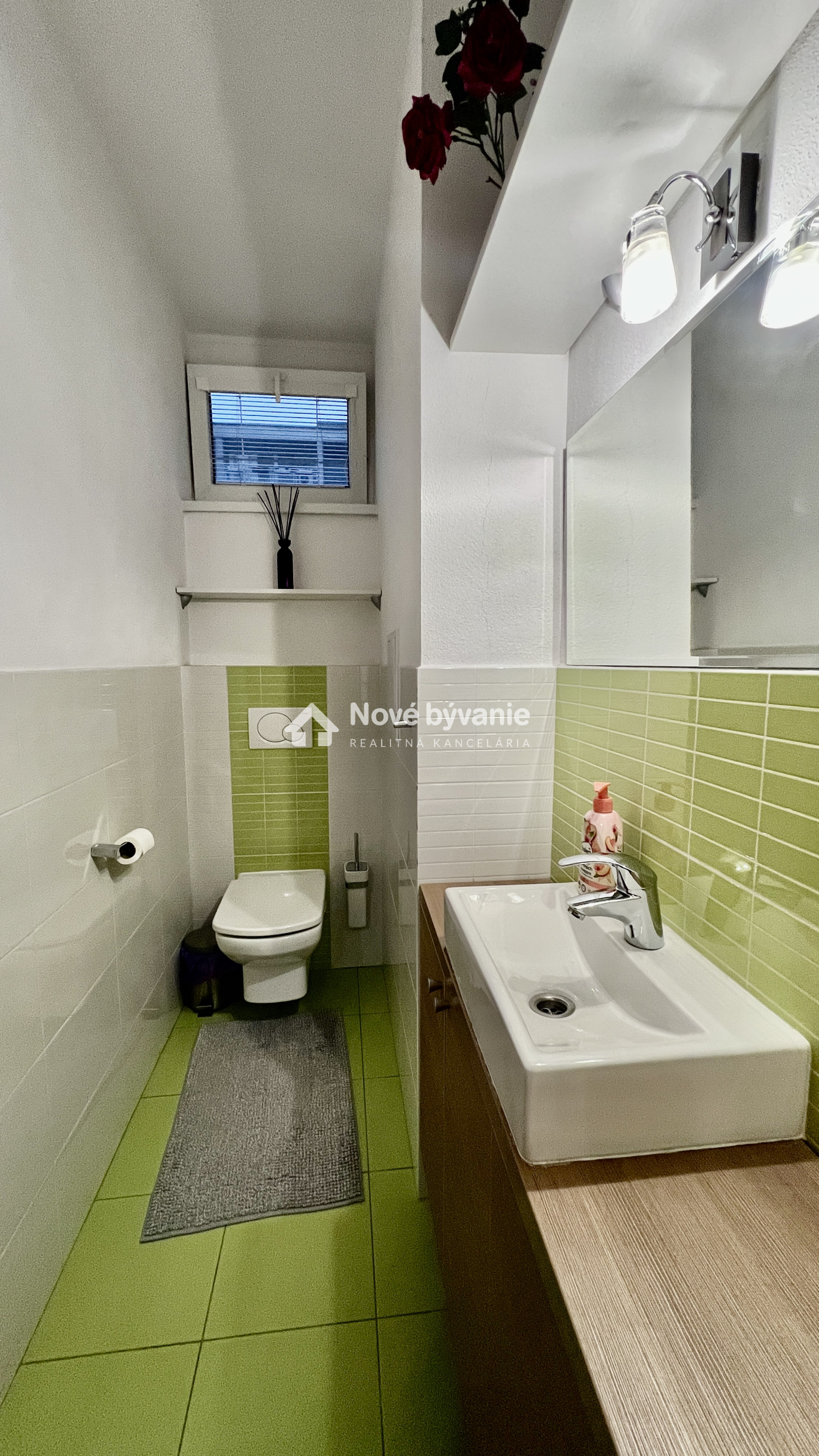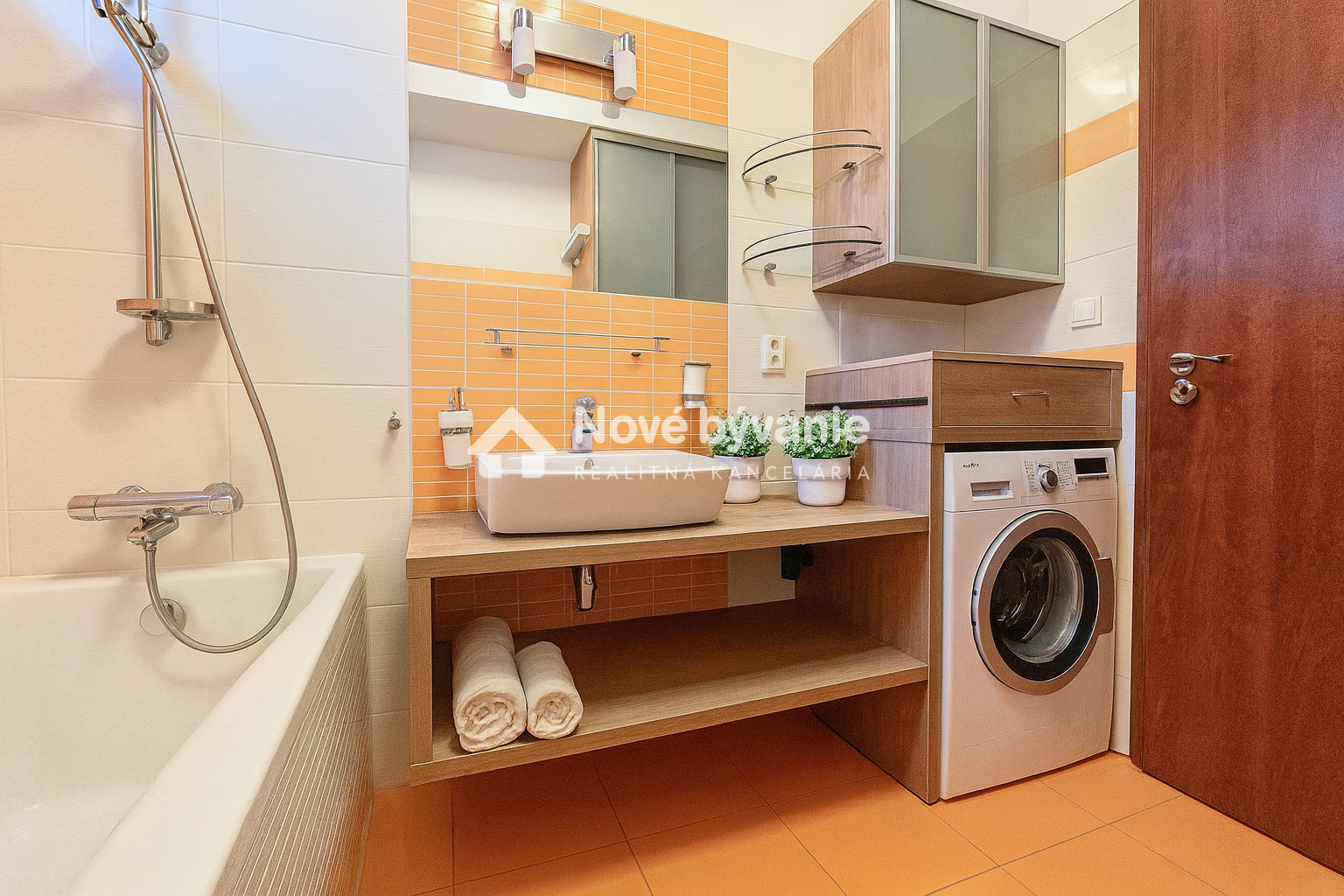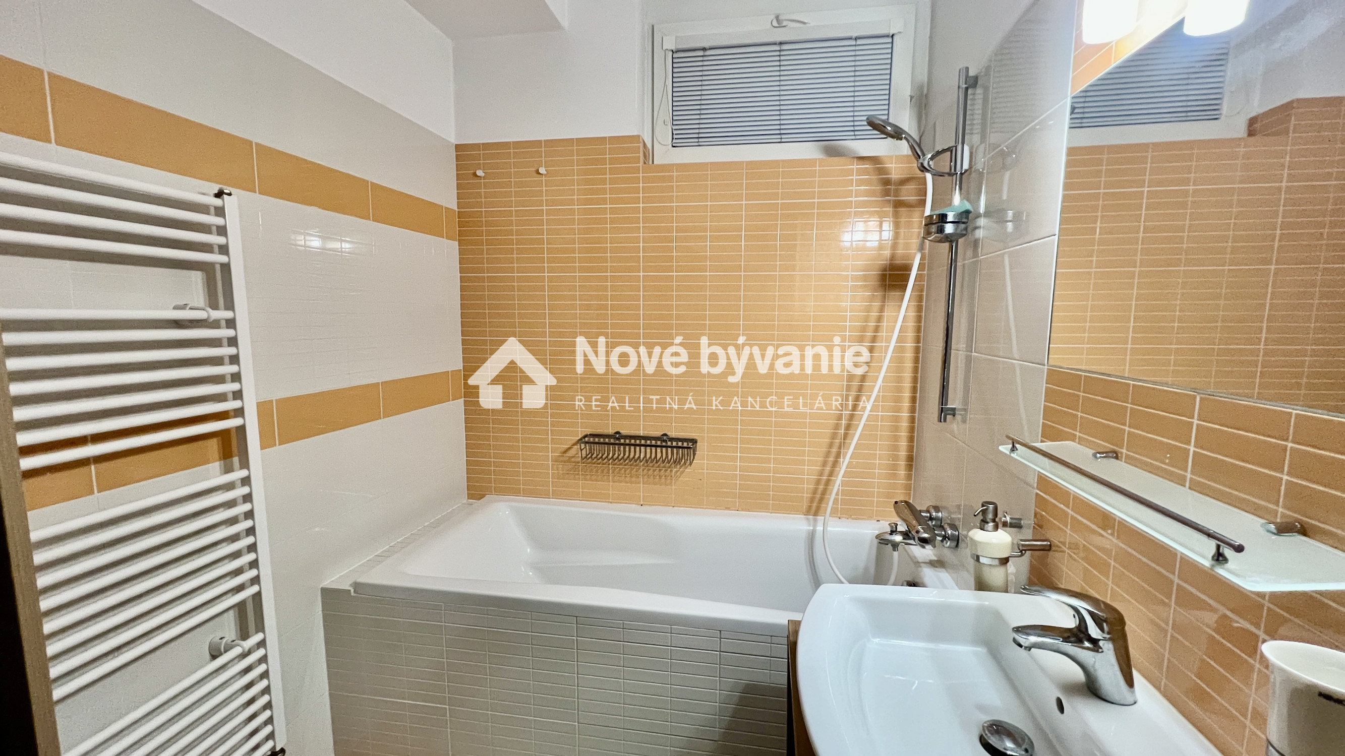 Súčasťou bytu je kúpeľňa s oknom (denné svetlo + priame vetranie), ktorej súčasťou je vaňa, umývadlo, rebrinový radiátor, práčka, a veľké množstvo odkladacích priestorov. WC je riešené ako samostatná miestnosť s oknom (svetlo, vetranie), súčasťou WC je aj umývadlo a odkladacia skrinka.